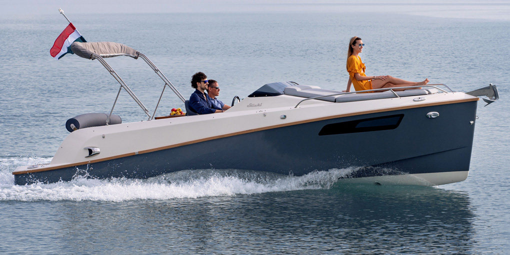 E-Boot mit Piktronik 40 kW Wellenantrieb, Lithium Batterien 46,3 kWh, KOP-Alarm, Rumpf: Blue-Grey, Deck: Creme White, Steuerkonsole: Graphite Grey, Beplankung Cockpit: Flexiteek im Teak Look mit schwarzen Fugen, Cockpitpolsterung Storm / Plata zweifarbig, Kabine: Nabucco Grey / White zweifarbig, Optionen gemäss Datenblatt.